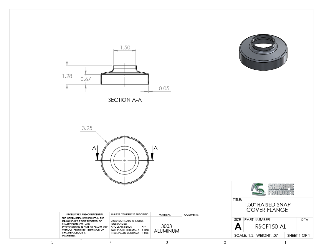 RAISED SNAP COVER FLANGE, 1 1/2 O.D., ALUM 3003 (3 1/4 DIA)