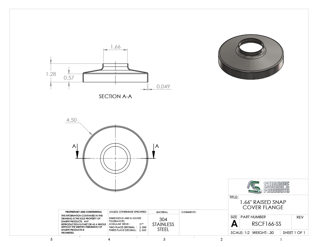 RAISED SNAP COVER FLANGE, 1 1/4 PIPE (1.66 O.D.), S/S 304