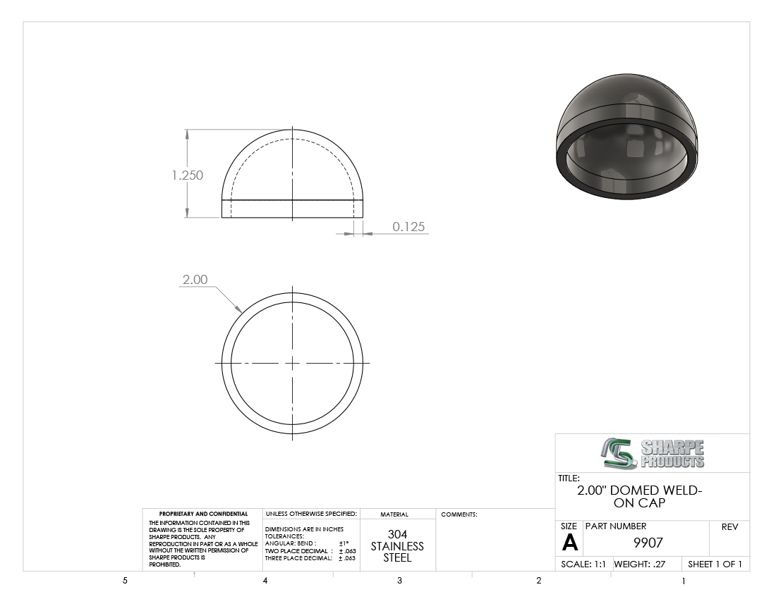 CAP S/S 304, 2 O.D. DOMED WELD ON