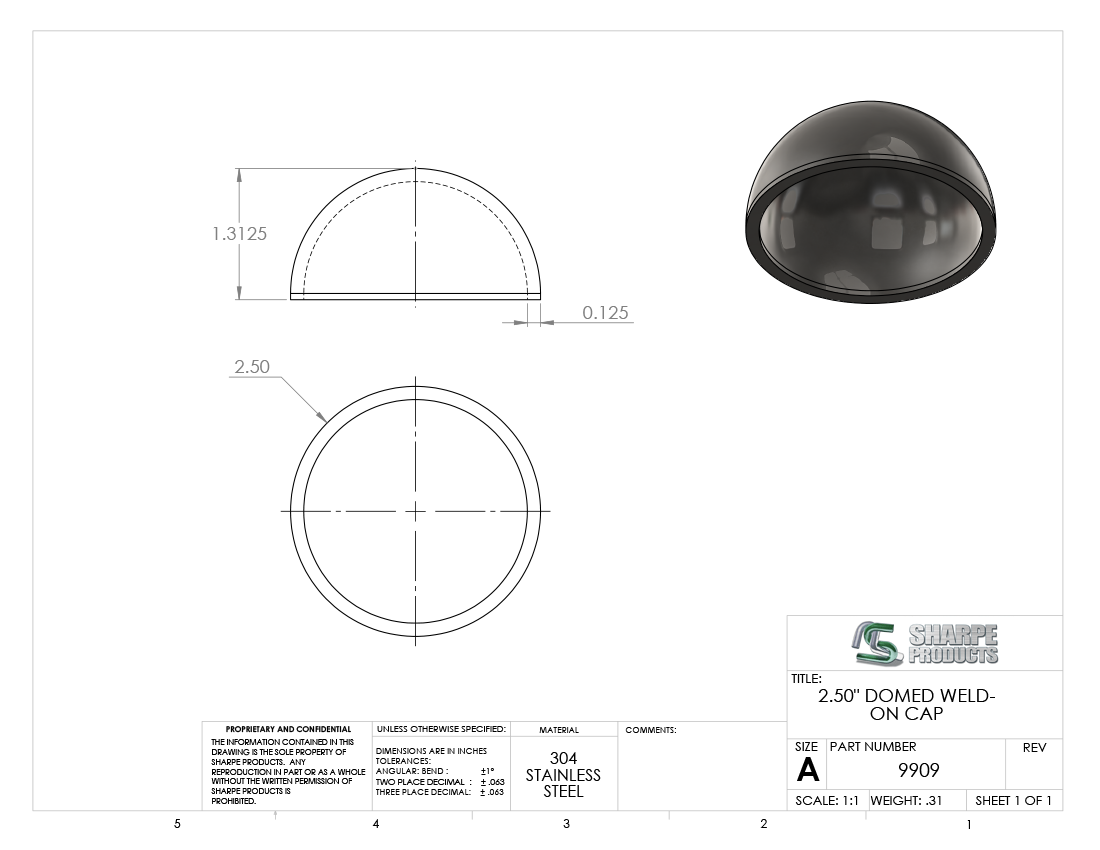 DO NOT USE THIS PART NUMBER, USE P/N H250-SS, IT IS THE SAME EXACT PART!!!! CAP S/S 304, 2 1/2 DIA. X 11 GAGE DOMED WELD ON **SAME PART AS H250-SS