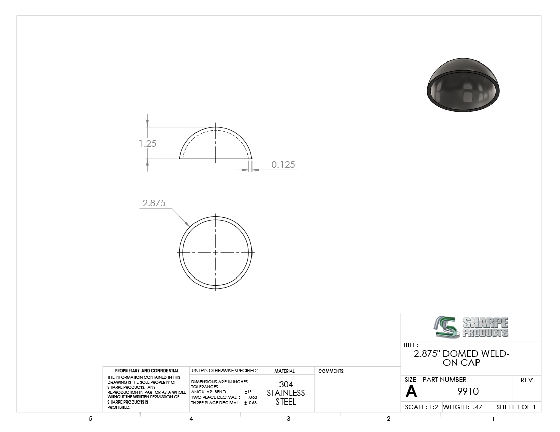 CAP S/S 304, 2 1/2 PIPE (2.875 O.D.) DOMED WELD ON