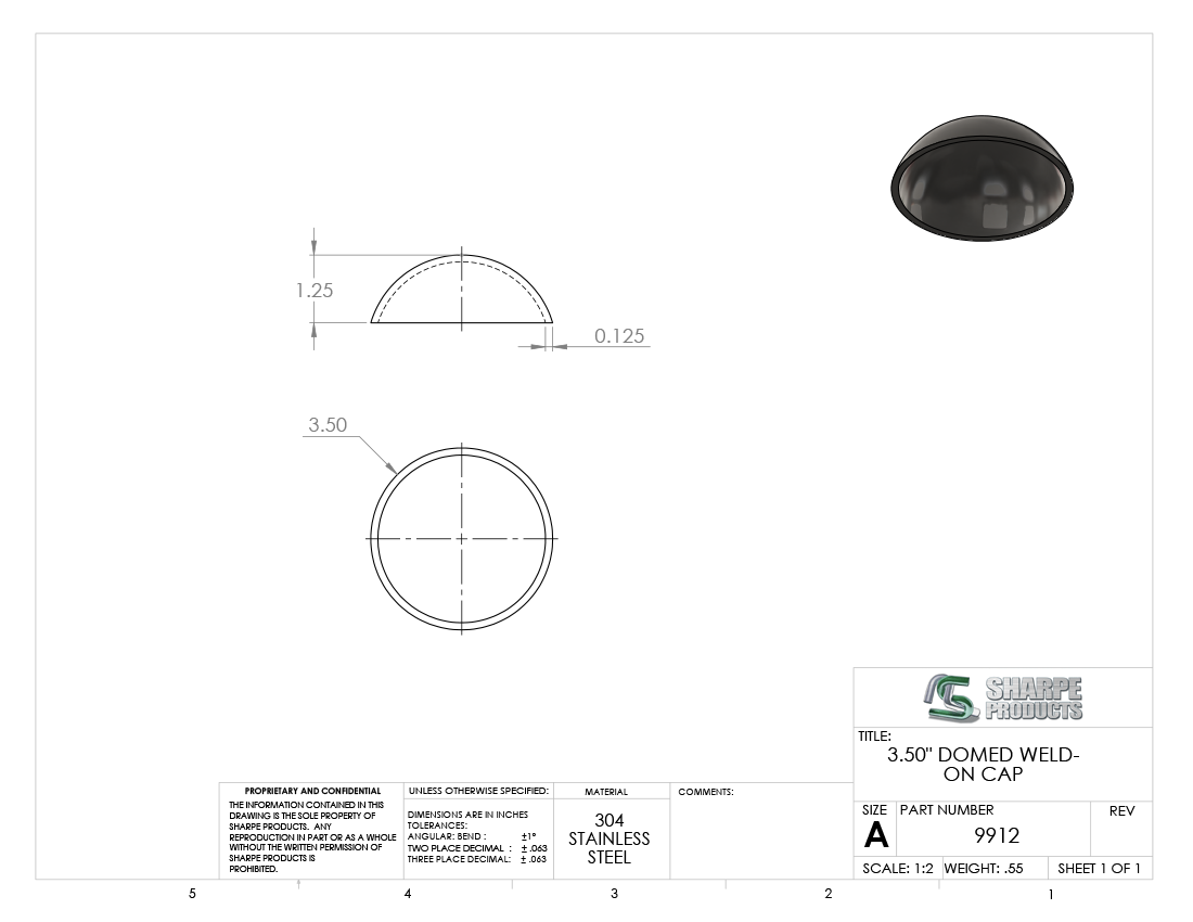 #9912 - STAINLESS STEEL DOMED WELD-ON CAP 3" PIPE