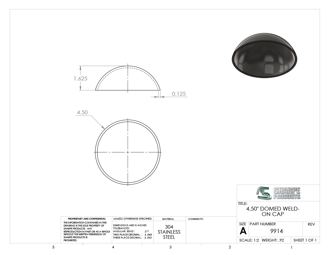 #9914 - STAINLESS STEELDOMED WELD-ON CAP 4" PIPE