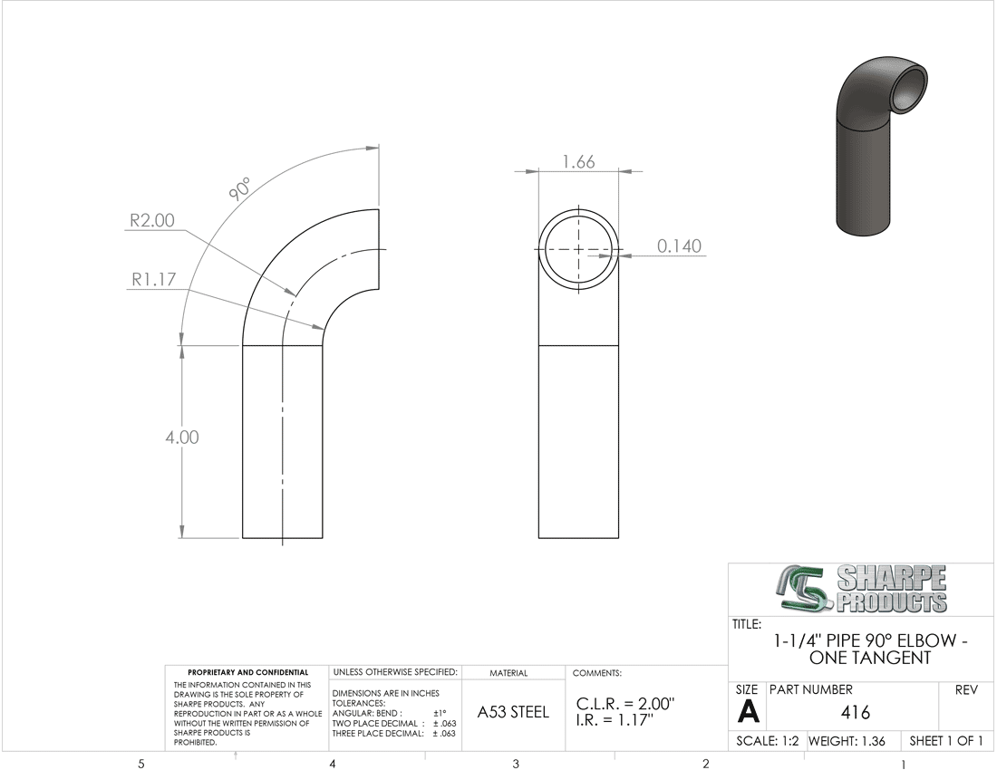 1 1/4 SCH 40 (1.66 O.D.) 90° ELL 2 C.L.R. W/ (1) 4 TAN., STEEL