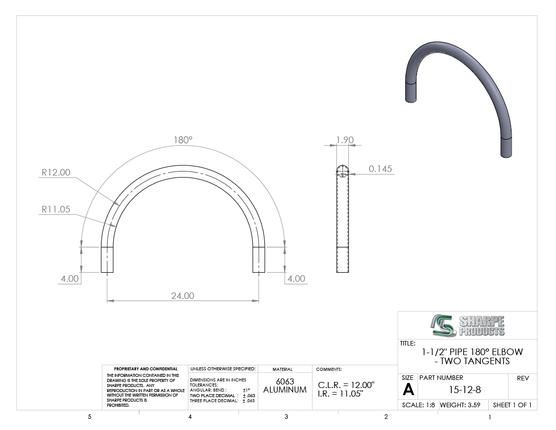 1 1/2 SCH 40 (1.90 O.D.) 180° ELL 12 C.L.R. W/ (2) 4 TANS., ALUM 6063 (24 CENTERLINE DIAMETER) NOTE: TOLERANCE ON THE RADIUS IS ±.25 **NON-RETURNABLE ITEM**