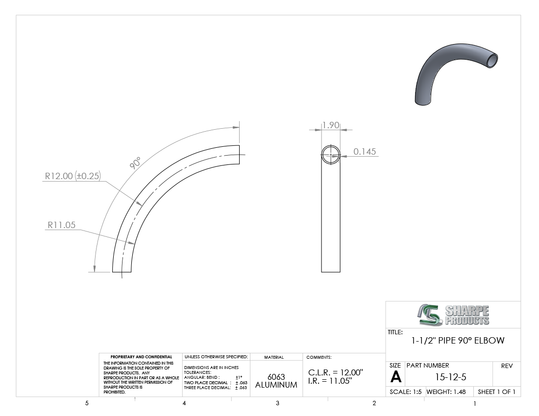 #15-12-5 - ALUMINUM 1 1/2" PIPE 90° ELBOW 12" C.L.R.