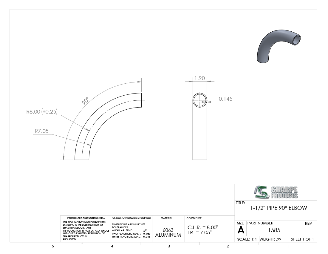 1 1/2 SCH 40 (1.90 O.D.) 90° ELL 8 C.L.R., ALUM 6063