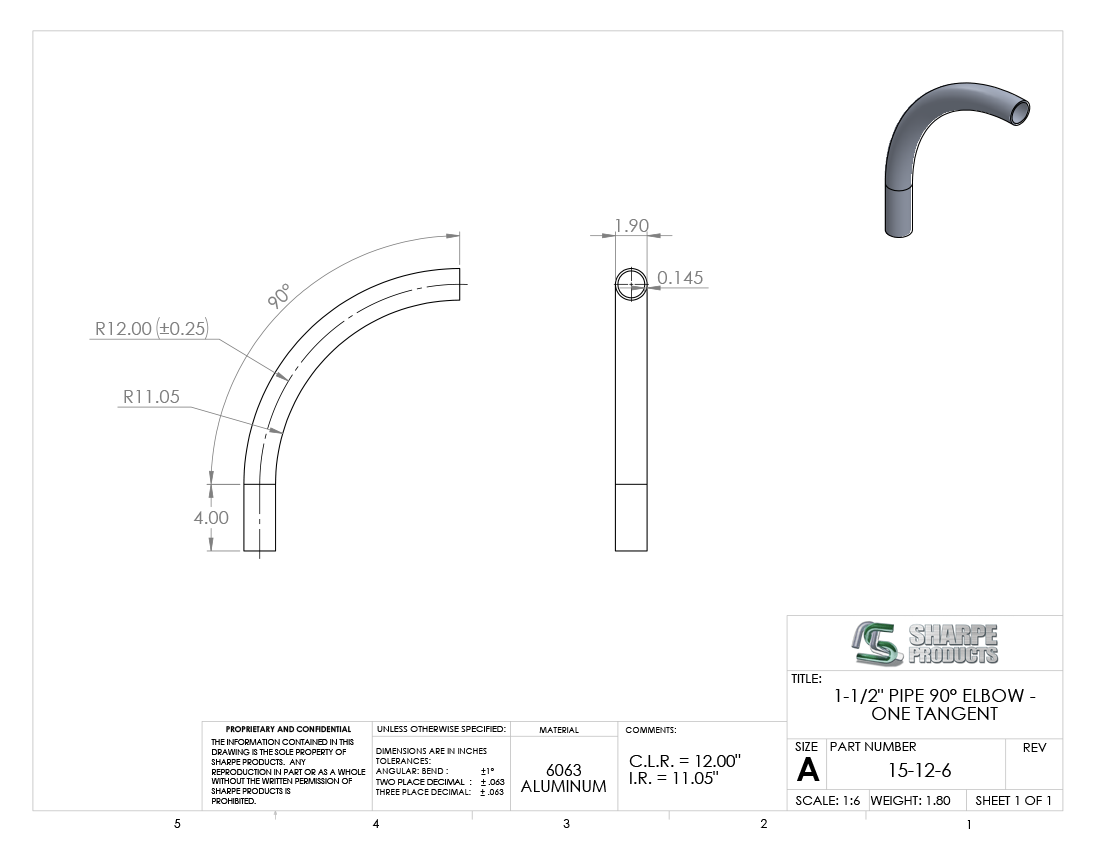 #15-12-6 - ALUMINUM 1 1/2" PIPE 90° ELBOW W/ 1 TANGENT 12" C.L.R.