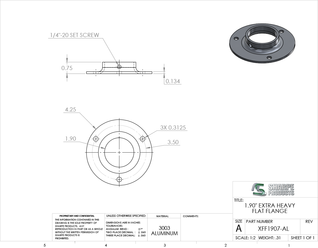 XTRA HVY FLAT FLANGE, 1 1/2 PIPE (1.90 O.D.) W/ (3) HOLES & SET SCREW, ALUM 3003