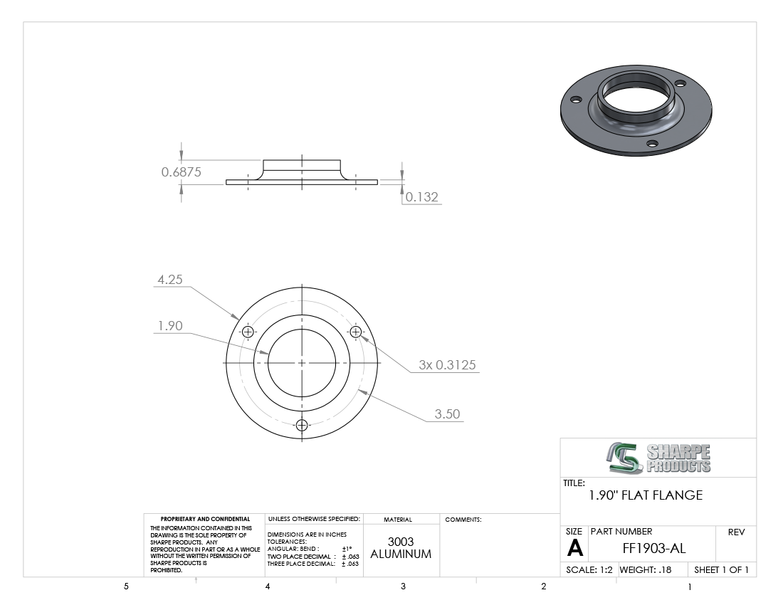 FLAT FLANGE, 1 1/2 PIPE (1.90 O.D.) W/ (3) HOLES, ALUM 3003