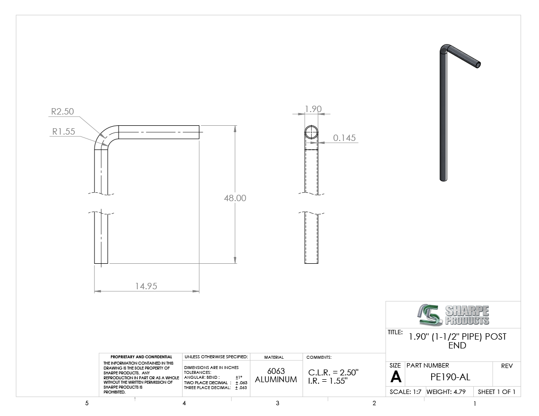 POST END, 1 1/2 SCH 40 (1.90 O.D.) 90° ELL 2 1/2 C.L.R. W/ (1) 48 & (1) 14.95 O.A. LEGS, ALUM 6063
