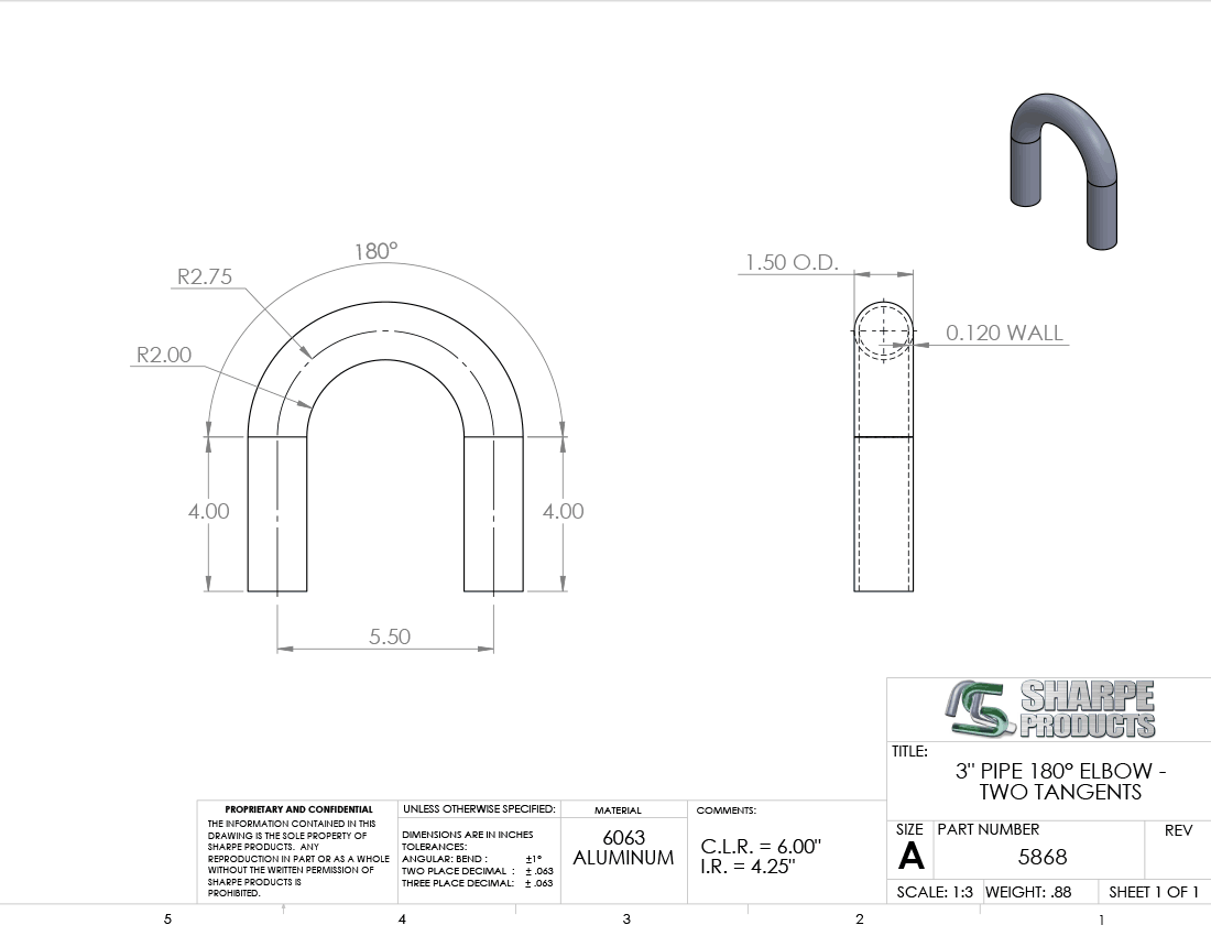 1 1/2 O.D. X .125 WALL 180° ELL 2 3/4 C.L.R. W/ (2) 4 TANS., ALUM 6061