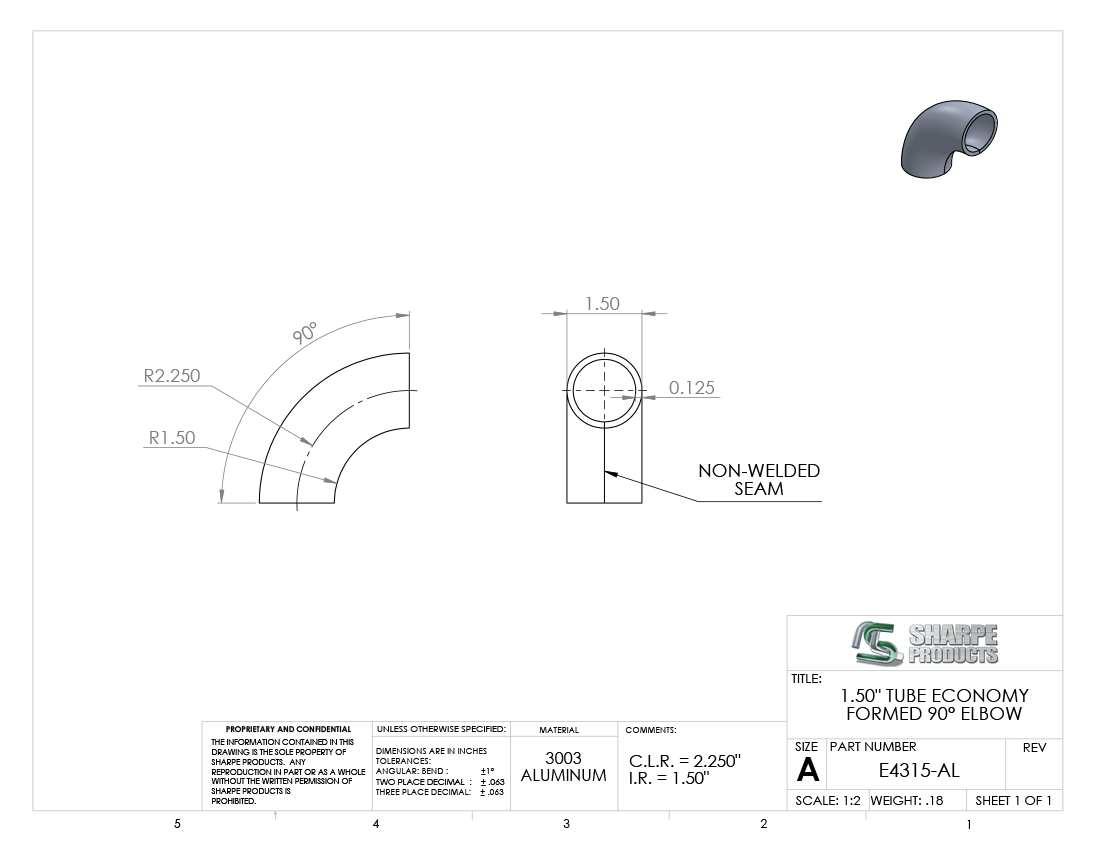 1 1/2 O.D. X .125 WALL 90° ELL 1 1/2 I.R. (2.25 C.L.R.) W/ SEAM, ALUM 3003 **ECONOMY FORMED ELBOWS, ENDS MAY NOT BE FLUSH!