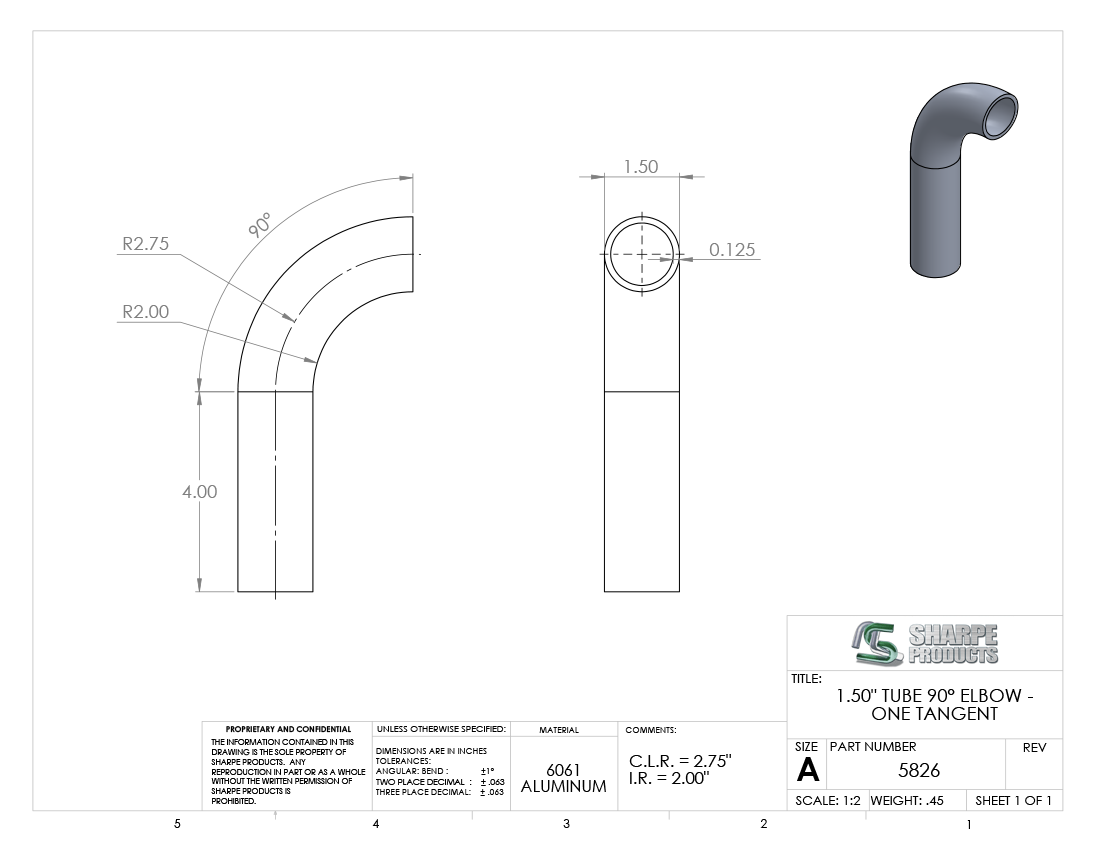 1 1/2 O.D. X .125 WALL 90° ELL 2 3/4 C.L.R. W/(1) 4 TAN., ALUM 6061