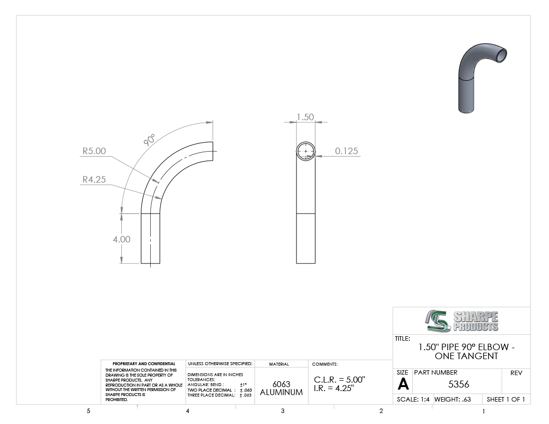 1 1/2 O.D. X .125 WALL 90° ELL 5 C.L.R. W/ (1) 4 TAN., ALUM 6061