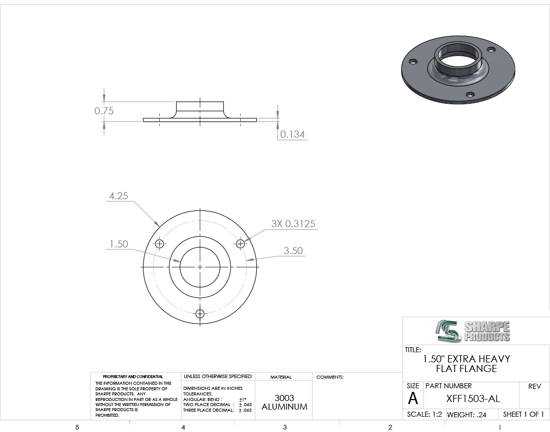 XTRA HVY FLAT FLANGE, 1 1/2 .D. W/ (3) HOLES, ALUM 3003