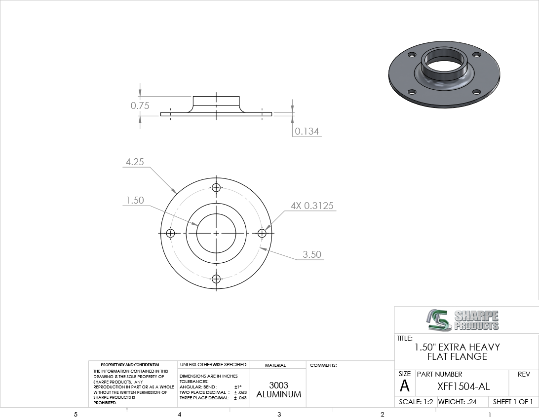 XTRA HVY FLAT FLANGE, 1 1/2 .D. W/ (4) HOLES, ALUM 3003