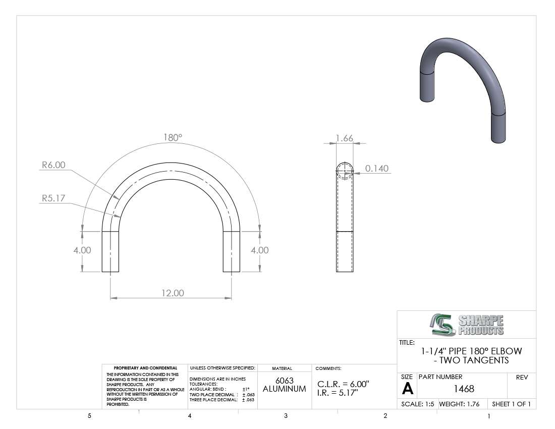 1 1/4 SCH 40 (1.66 O.D.) 180° ELL 6 C.L.R. W/ (2) 4 TANS., ALUM 6063