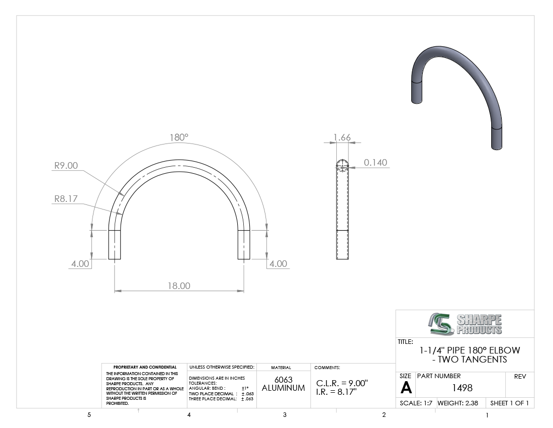 1 1/4 SCH 40 (1.66 O.D.) 180° ELL 9 C.L.R. (± .25) W/ (2) 4 TANS., ALUM 6063 **NON-RETURNABLE ITEM**
