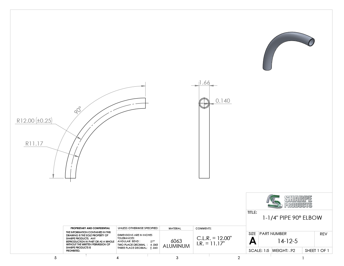 1 1/4 SCH 40 (1.66 O.D.) 90° ELL 12 C.L.R. (± .25), ALUM 6063
