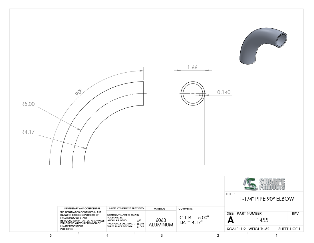 1 1/4 SCH 40 (1.66 O.D.) 90° ELL 5 C.L.R., ALUM 6063