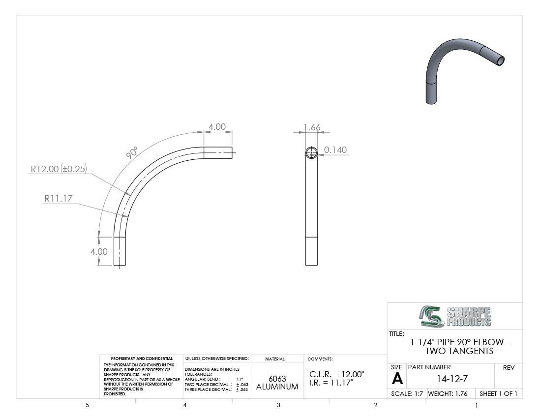 #14-12-7 - ALUMINUM 1 1/4" PIPE 90° ELBOW W/ 2 TANGENTS 12" C.L.R.