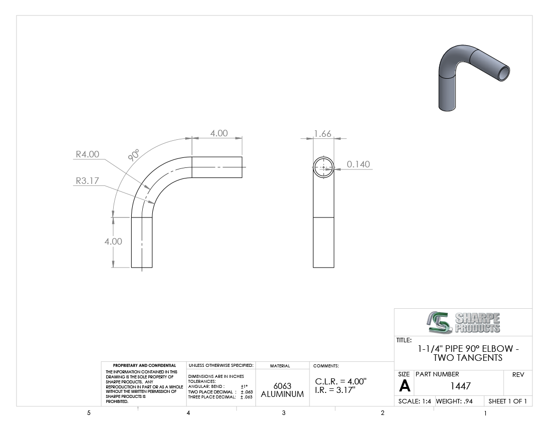 #1447 - ALUMINUM 1 1/4" PIPE 90° ELBOW W/ 2 TANGENTS 4" C.L.R.