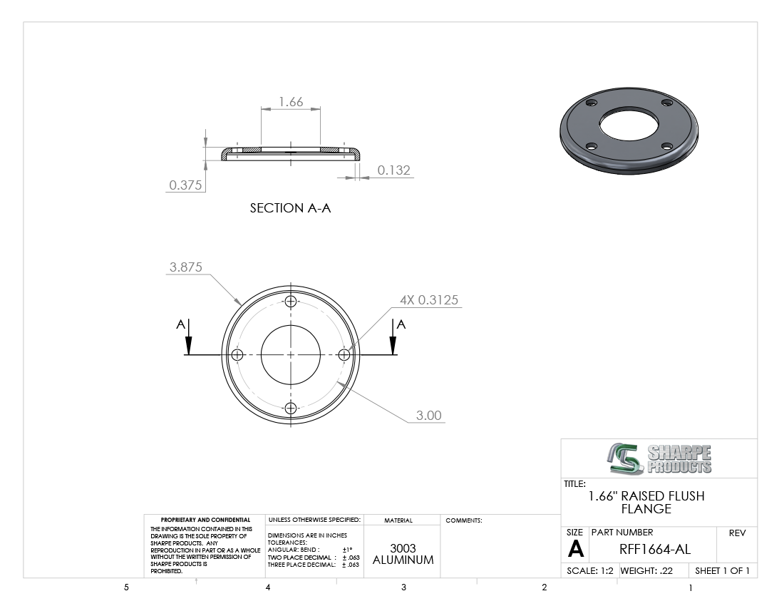 RAISED FLUSH FLANGE, 1 1/4 PIPE (1.66 O.D.) W/ (4) HOLES, ALUM 3003
