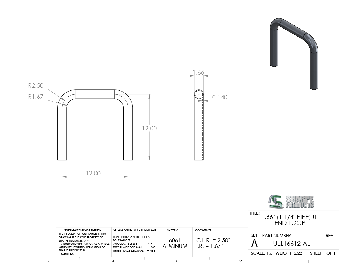 U-END LOOP, 1 1/4 SCH 40 (1.66 O.D.) BENT 90° ON A 2 1/2 C.L.R. (2) PLCS, 12 C-C W/(2) 12 C-E LEGS, ALUM 6063 TOLERANCES: ±.063