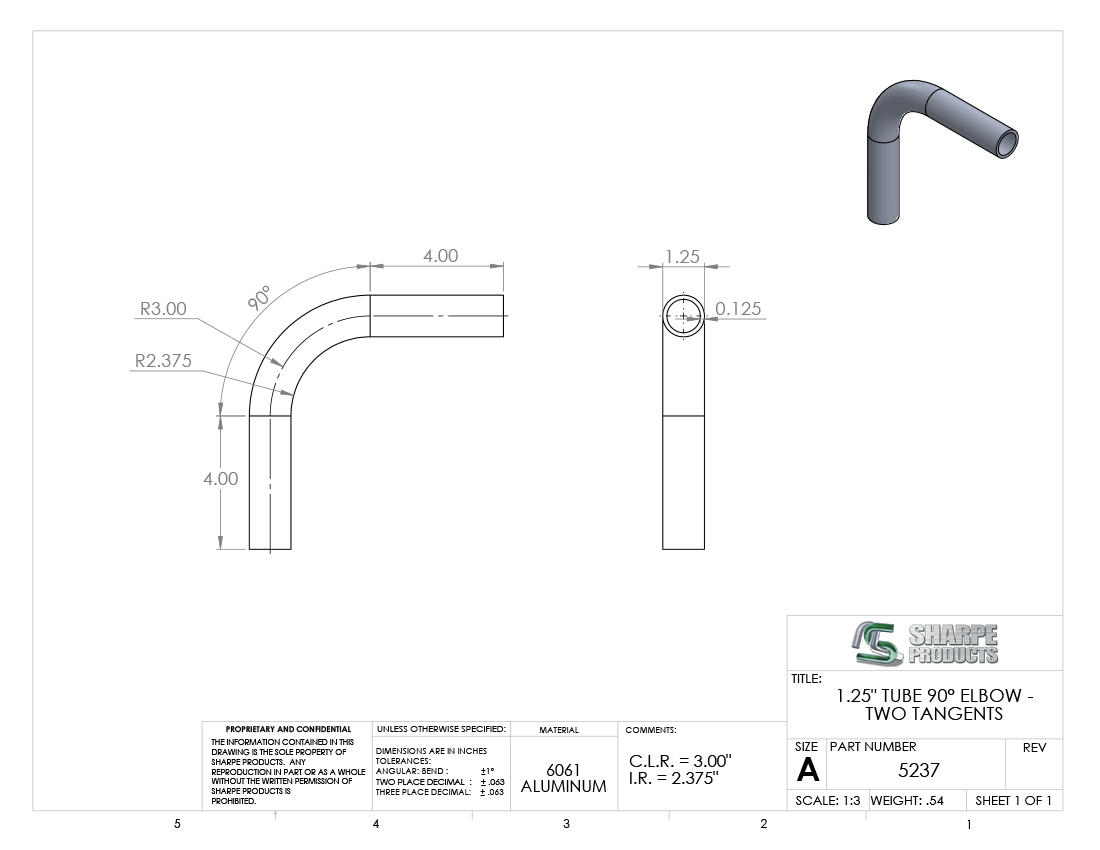 1 1/4 O.D. X .125 WALL 90° ELL 3 C.L.R. W/ (2) 4 TANS., ALUM 6061