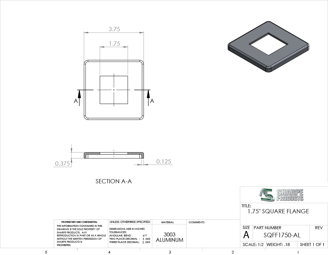 SQ. FLUSH FLANGE, 1 3/4 W/ NO HOLES, ALUM 3003