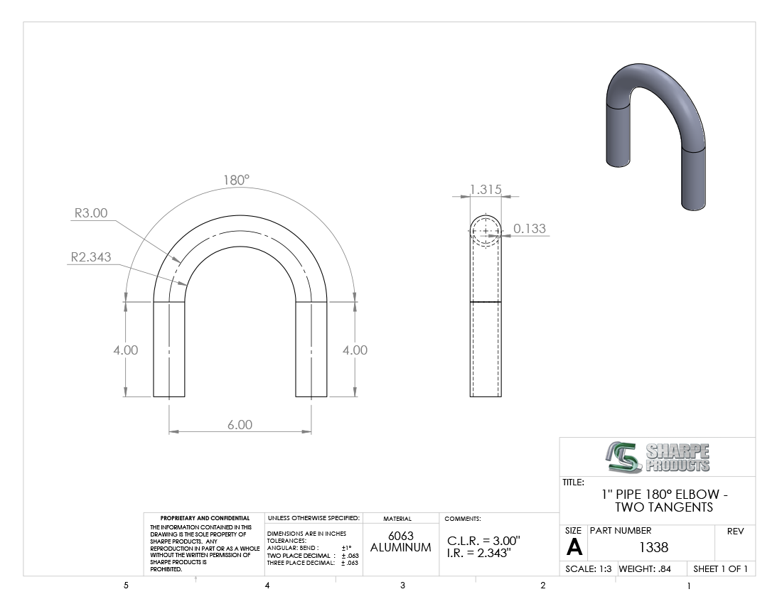 1 SCH 40 (1.315 O.D.) 180° ELL 3 C.L.R. W/ (2) 4 TANS., ALUM 6063