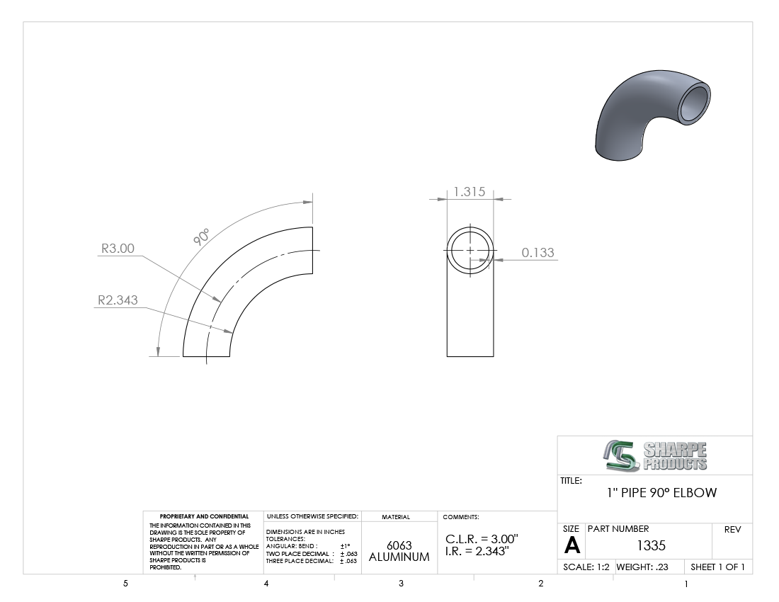 1 SCH 40 (1.315 O.D.) 90° ELL 3 C.L.R., ALUM 6063