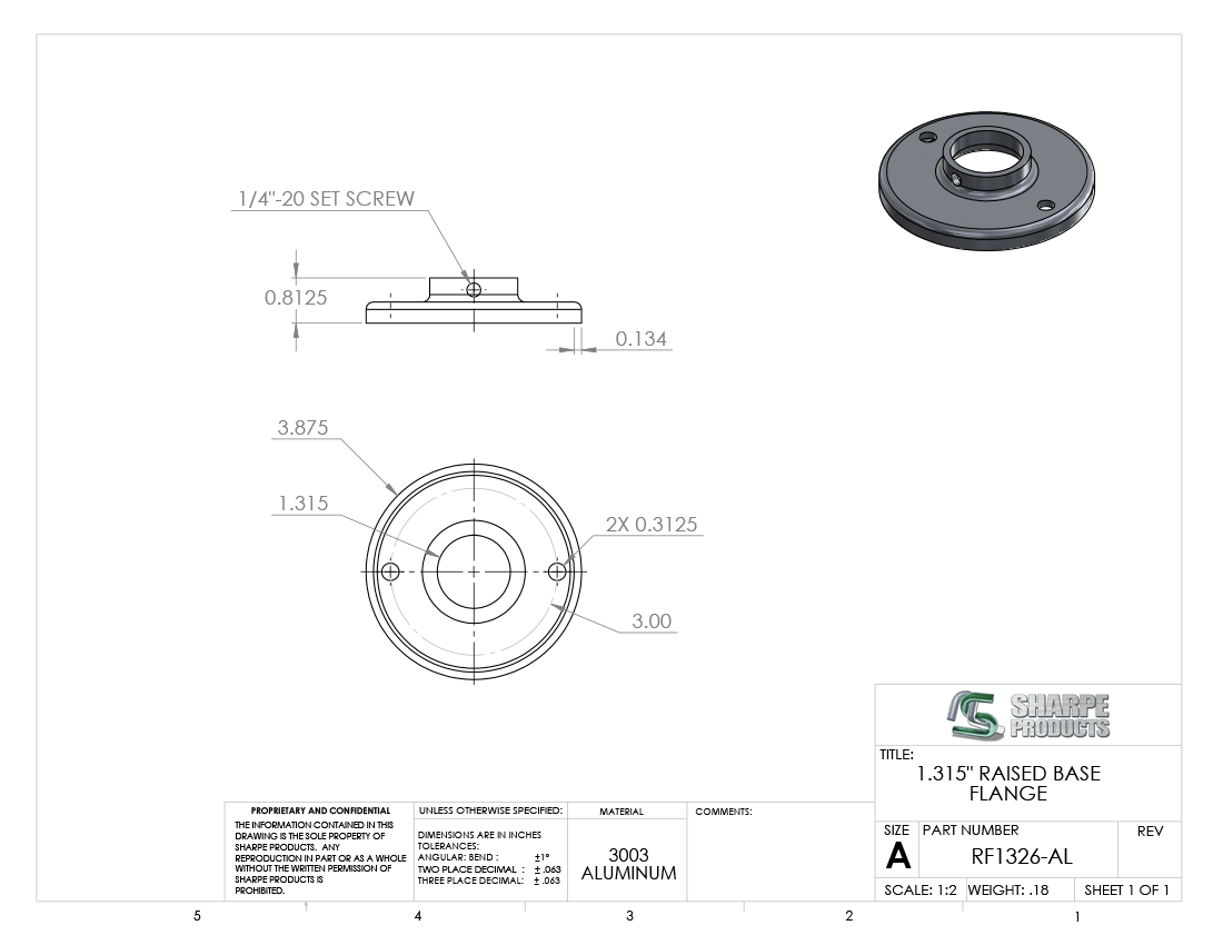 RAISED FLANGE, 1 PIPE (1.315 OD) W/ (2) HOLES & SET SCREW, ALUM 3003