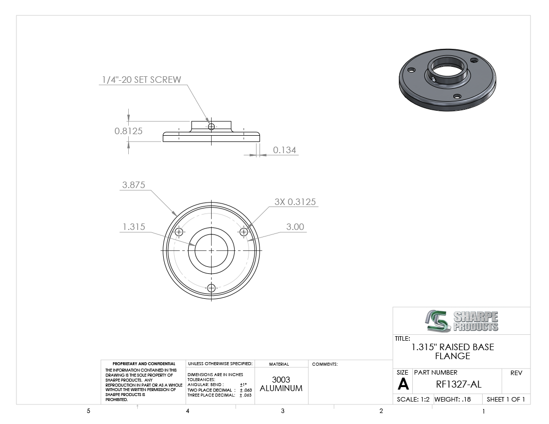 RAISED FLANGE, 1 PIPE (1.315 OD) W/ (3) HOLES & SET SCREW, ALUM 3003