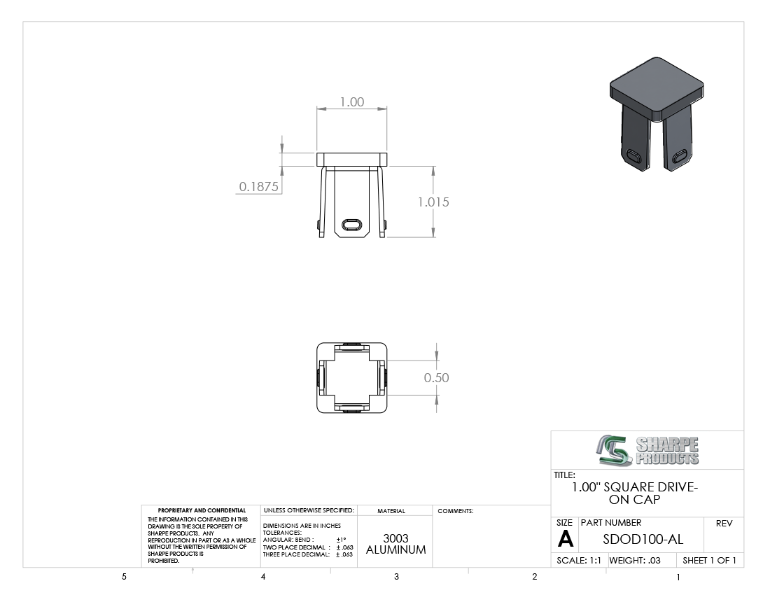 SQ. DRIVE-ON DISK, 1 SQ. X 3/16 THICK (FOR .125 WALL), ALUM 3003