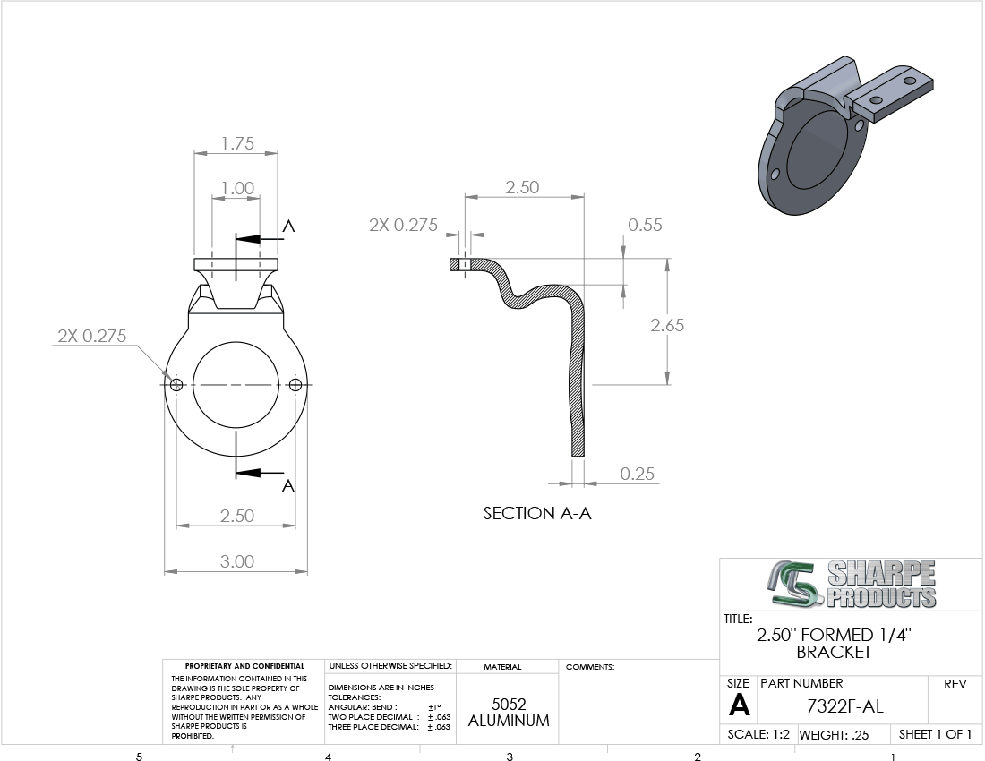 #7322F-AL - ALUMINUM 1/4" FORMED BRACKET, 2 1/2" C.L., FLAT SADDLE