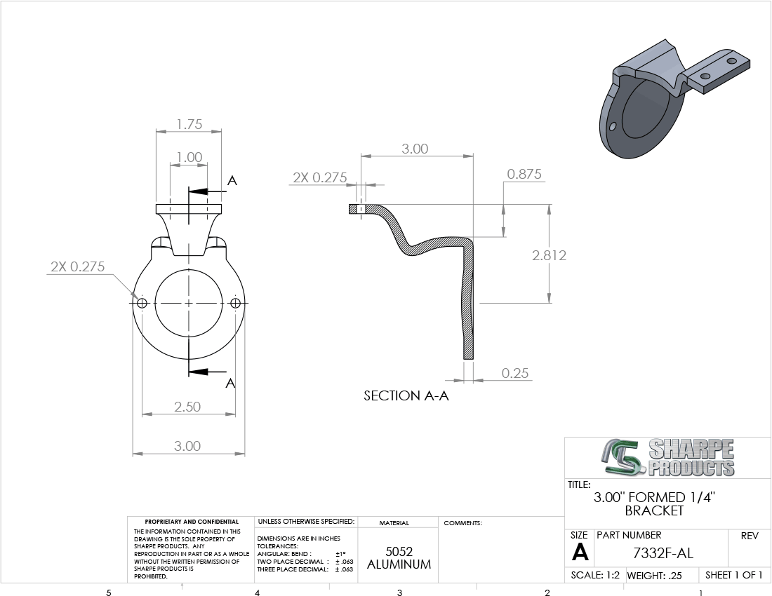 BRACKET ALUM (5052), 1/4 THK X 3 C.L. W/ (2) HOLES & FLAT SADDLE