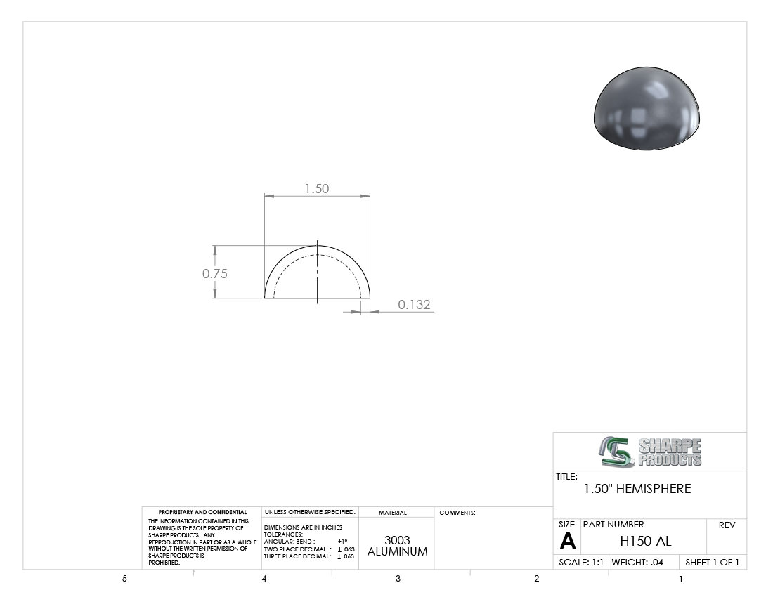HEMISPHERE ALUM (3003), 1 1/2 DIA. X .132 THICK