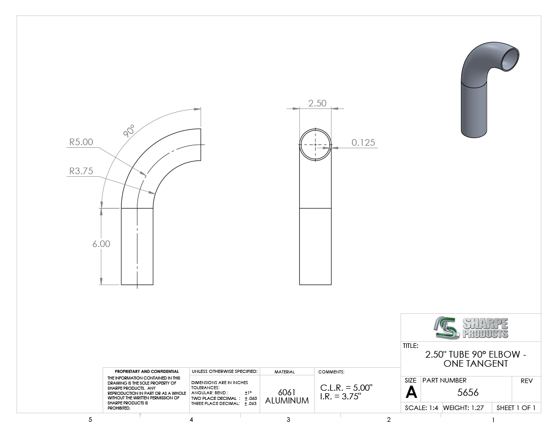 2 1/2 O.D. X .125 WALL 90° ELL 5 C.L.R. W/ (1) 5 TAN., ALUM 6061