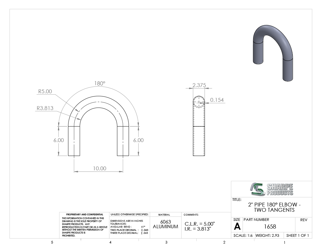 2 SCH 40 (2.375 O.D.) 180° ELL 5 C.L.R. W/ (2) 6 TANS., ALUM 6063