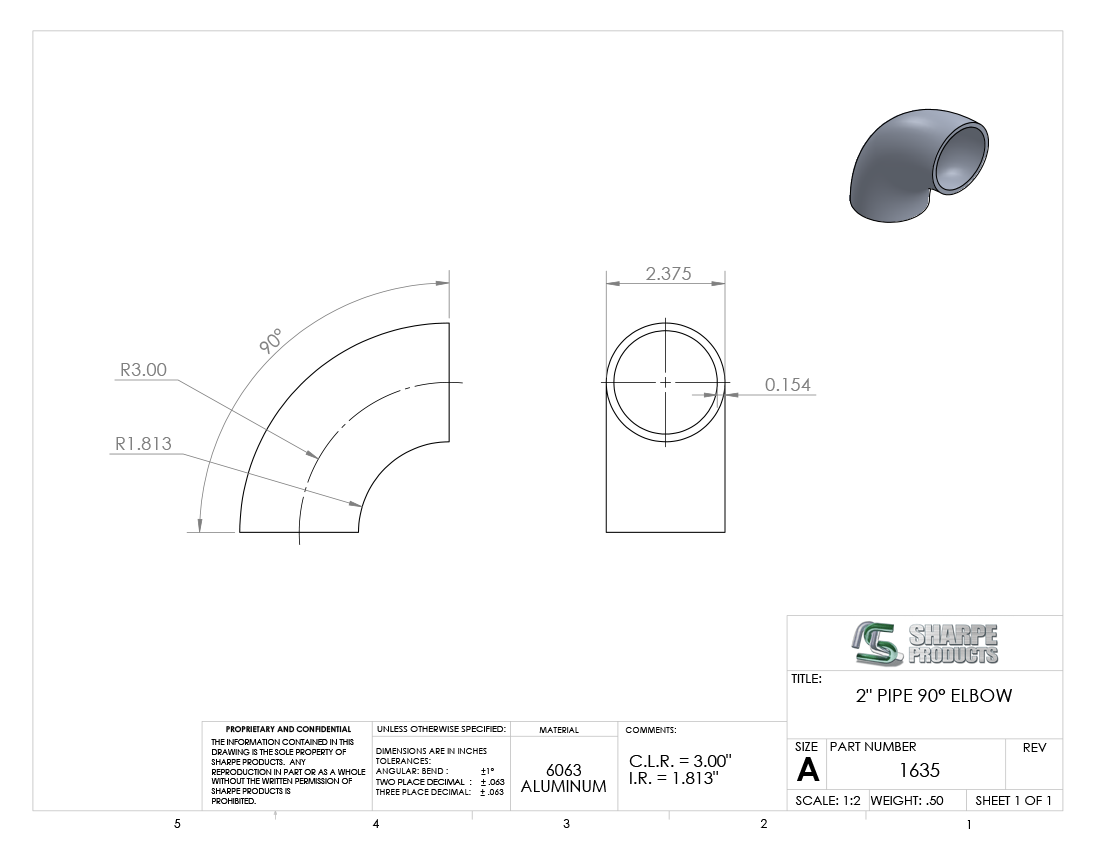 #1635 - ALUMINUM 2" PIPE 90° ELBOW 3" C.L.R.