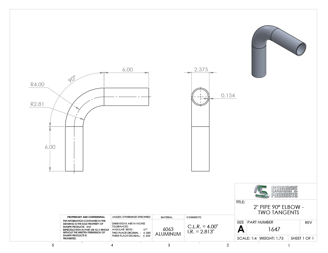 #1647 - ALUMINUM 2" PIPE 90° ELBOW W/ 2 TANGENTS 4" C.L.R.