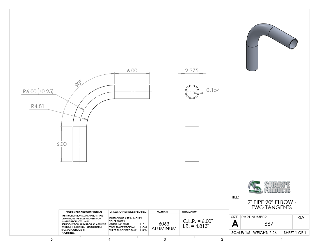 #1667 - ALUMINUM 2" PIPE 90° ELBOW W/ 2 TANGENTS 6" C.L.R.