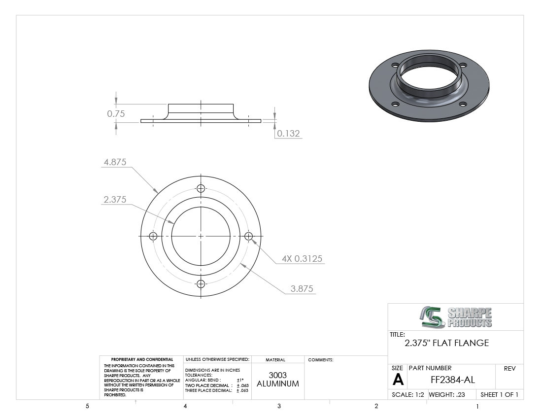 FLAT FLANGE, 2 PIPE (2.375 O.D.) W/ (4) HOLES, ALUM 3003