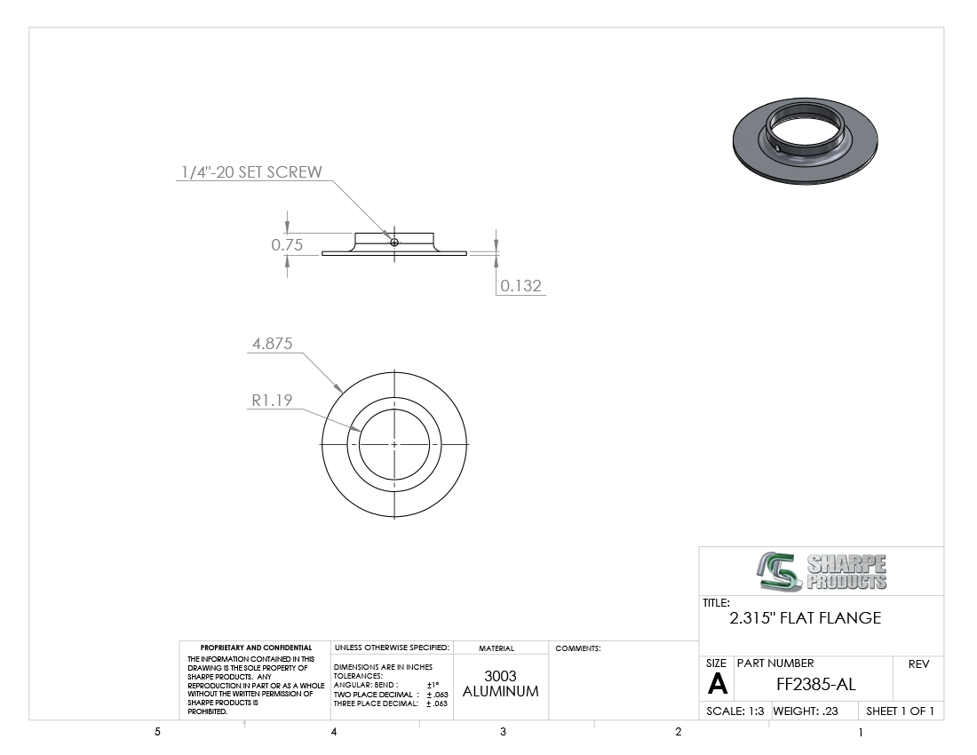FLAT FLANGE, 2 PIPE (2.38 O.D.) W/ SET SCREW, ALUM 3003