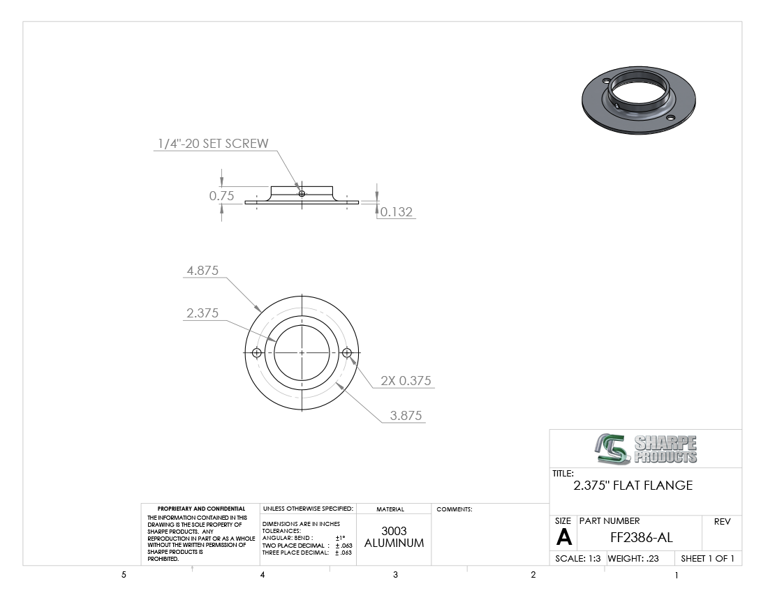 FLAT FLANGE, 2 PIPE (2.38 O.D.) W/ 2 HOLES, O.D.) W/ SET SCREW, ALUM 3003