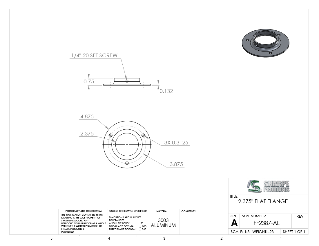 FLAT FLANGE, 2 PIPE (2.38 O.D.) W/ (3) HOLES & SET SCREW, ALUM 3003