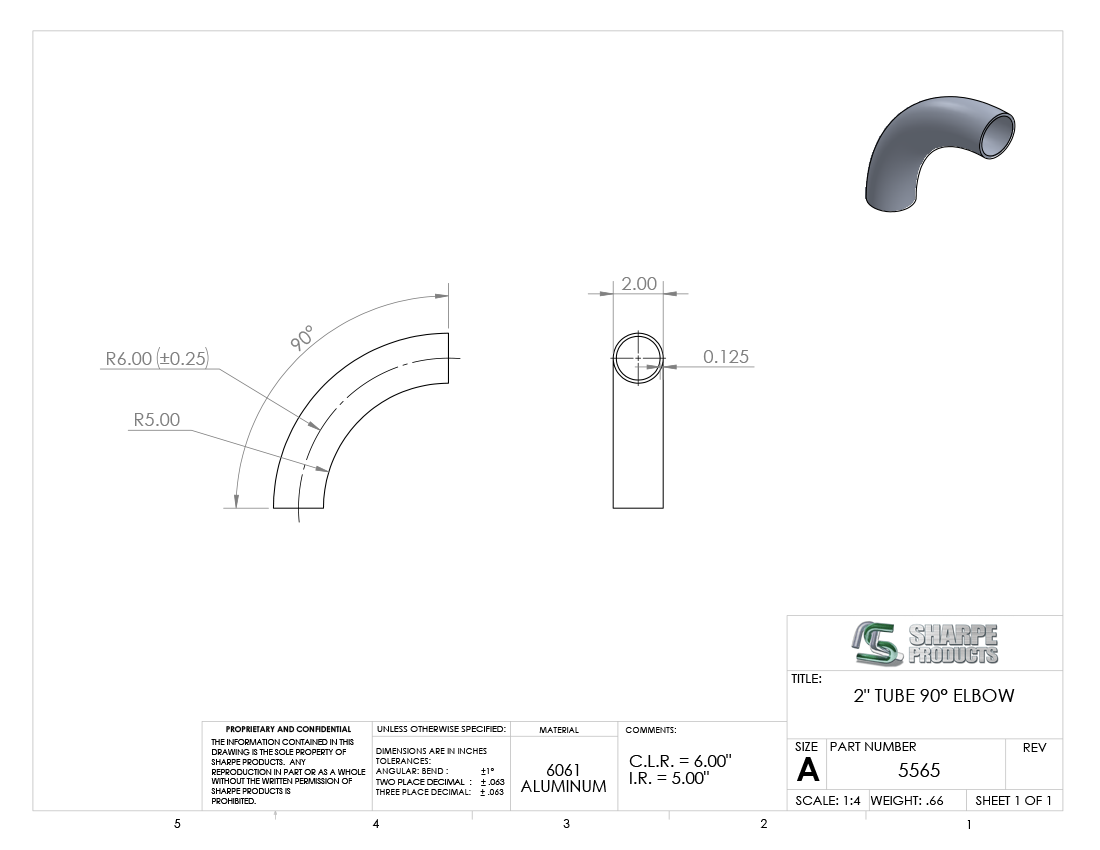 #5565 - ALUMINUM 2" TUBE 90° ELBOW 6" C.L.R.