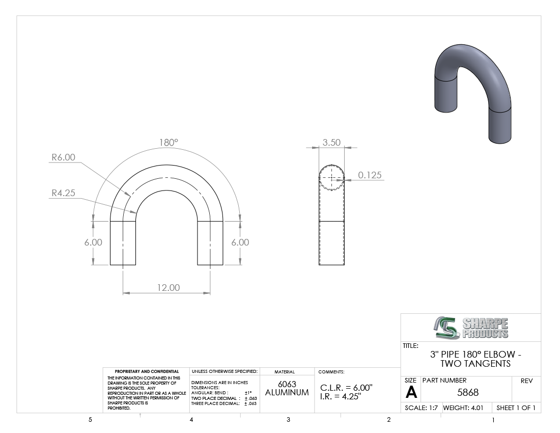 3 1/2 O.D. X .125 WALL 180° ELL 6 C.L.R. W/ (2) 6 MINIMUM TANS., ALUM 6061